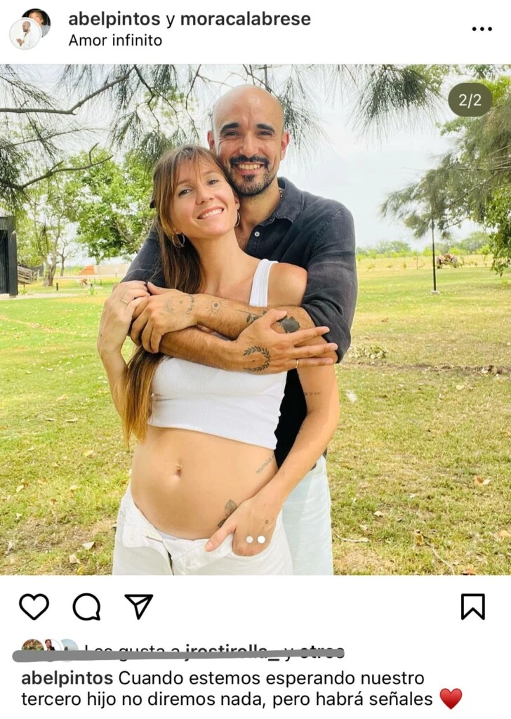 Abel Pintos usó sus redes sociales para anunciar con mucha felicidad que será papá por tercera vez junto a Mora Calabrese, la madre de su hijo Agustín. La noticia tomó por sorpresa a sus seguidores que automáticamente le dedicaron mensajes de amor y buenos deseos.