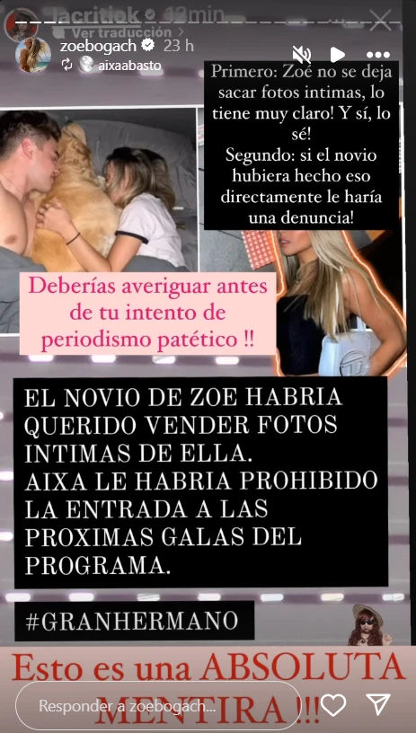 "¡¡Esto es una absoluta mentira!! Deberías averigua antes de tu intento de periodismo patético. Primero: Zoe no se deja sacar fotos íntimas, ¡lo tiene muy claro! Y sí, lo sé. Segundo: si el novio hubiera hecho eso, directamente le haría una denuncia", le contestó Aixa a La Criti.
