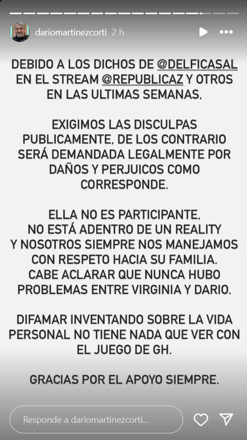 “Debido a los dichos de Delfina en stream, exigimos las disculpas públicamente. De lo contrario, será demandada legalmente por daños y perjuicios como corresponde. Ella no es participante, no está adentro de un reality y nosotros siempre nos manejamos con respeto hacia su familia. Nunca hubo problemas entre Virginia y Darío. Difamar inventando sobre la vida personal no tiene nada que ver con el juego de GH”, expresaron desde Instagram.