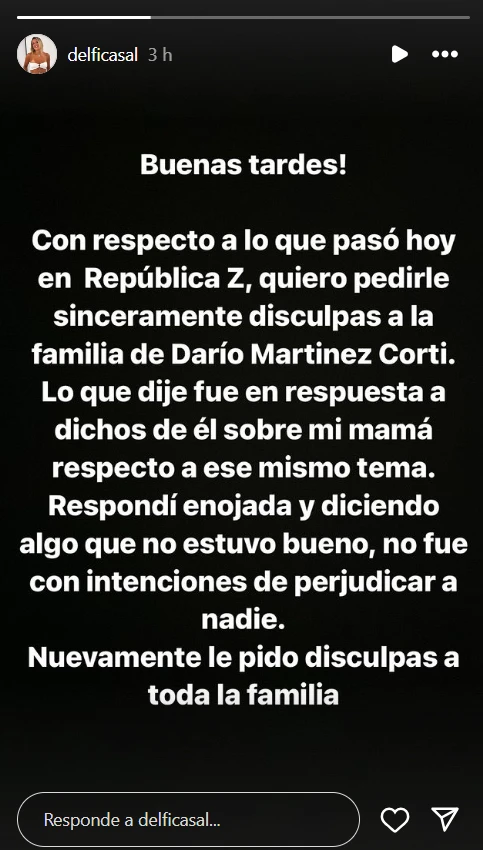 “Con respecto a lo que pasó hoy, quiero pedirle sinceramente disculpas a la familia de Darío. Lo que dije fue en respuesta a dichos de él sobre mi mamá respecto a ese mismo tema. Respondí enojada y diciendo algo que no estuvo bueno, no fue con intenciones de perjudicar a nadie. Nuevamente le pido disculpas a toda la familia”, afirmó la hija de Virginia, buscando darle un cierre al asunto.