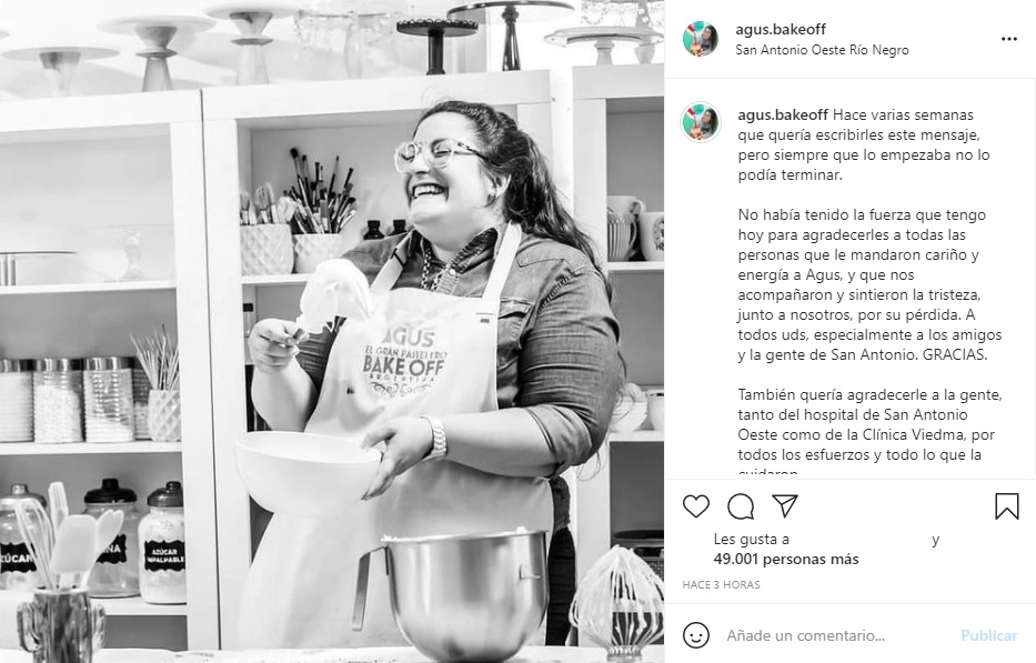 En su emotivo posteo donde se la ve sonriendo, Nicolás la describió y reveló qué se encontraba haciendo antes de contraer el virus y fallecer: "Agus era una persona especial, que contagiaba de alegría a todos los que la conocíamos. Como ella contaba, estaba cumpliendo muchos de sus sueños. Amaba poder compartir todo lo que había aprendido (estaba muy contenta y entusiasmada por sus clases de pastelería y chocolatería en una escuela de acá, y por un libro de recetas que estaba escribiendo). Siempre con mucho esfuerzo, pero con la felicidad del que ama lo que hace".