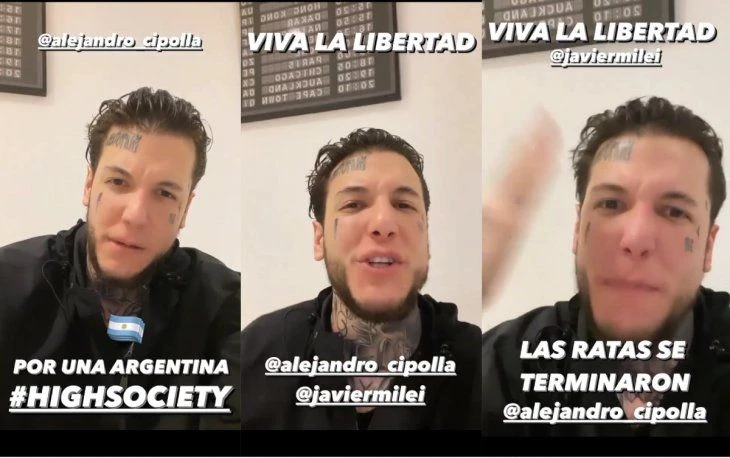 “¿Qué se piensan, que voy a dejar que ganen estos zurdos empobrecedores hijos de p...? No, ahora cambió todo, esos zurdos ,las ratas quedaron out. Las ratas murieron, se les acabó su tiempo, salieron de las cloacas y quedaron todos envenenados. ¿Me entendés a lo que voy? Se viene una nueva Argentina, una revolución con mi amigo, el peluca Milei. ¡Viva la libertad!”, continuó Alexander, fiel a su estilo prepotente.