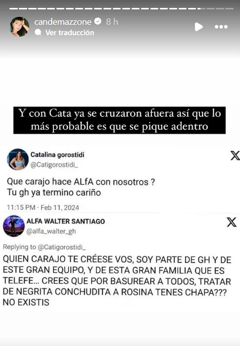 El conflicto entre Alfa y Catalina afuera de la casa, comenzó antes de que la jugadora vuelva en el repechaje, cuando se cruzaron en una gala. "¿Qué caraj... hace Alfa con nosotros? Tu GH ya terminó cariño", escribió la médica del reality tras su encuentro con Walter Santiago.