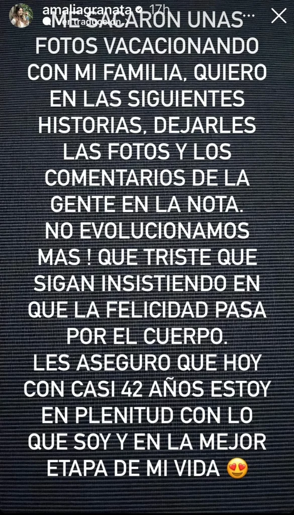 "Me sacaron unas fotos vacacionando con mi familia. Quiero, en las siguientes historias, dejarles las fotos y los comentarios de la gente en la nota. ¡No evolucionamos más!" reza la primera parte del comunicado compartido por Amalia Granata a sus más de 930 mil seguidores.