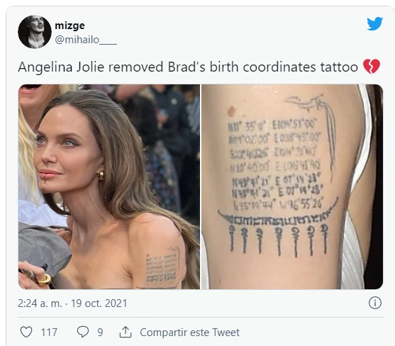 Jolie tenía siete tatuajes escalonados conformados por números. Estos números representan las coordenadas del lugar de nacimiento de las personas que más le importan en su vida: sus 6 hijos Shiloh, Zahara, Vivienne, Knox, Maddox y Pax.
