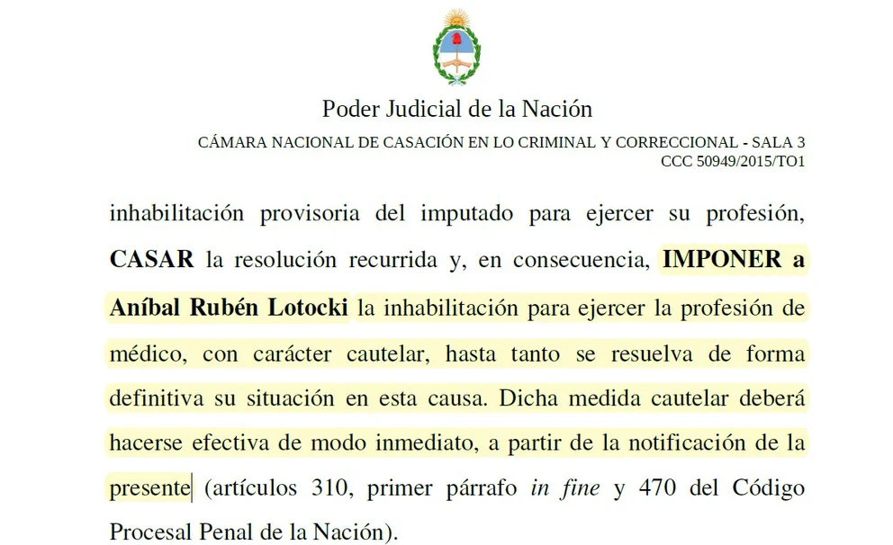 Los jueces de Casación hicieron efectiva la medida para evitar que se sigan sumando nuevas víctimas. “No puede prescindirse de la verificación de una reiteración de hechos lesivos a la salud pública como producto del ejercicio de la profesión, pues, en las particulares circunstancias, la condena impuesta abarca cuatro casos de similares características que, siempre de acuerdo a la decisión recurrida, generaron graves daños a la salud de las pacientes del señor Lotocki”, aclara el escrito.