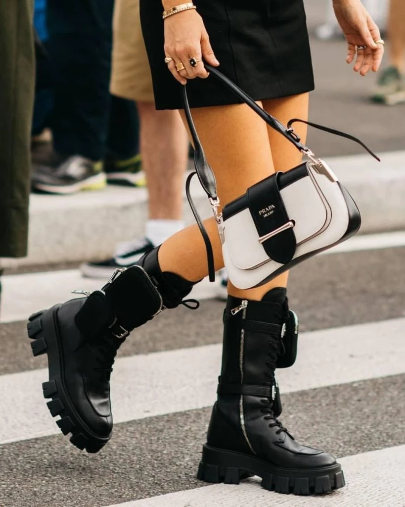 En la foto que posteó se la puede ver andando en patineta y luciendo una versión de botas militares de caña baja, decorada con pequeños monederos laterales con la logomanía de Prada en un aplique metálico, que son la última tendencia en esta nueva temporada.