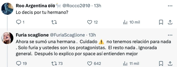 Además, otro usuarios de X consultó, curioso: "¿Qué pasó?". Para ordenar la situación, la hermana mayor de Juliana expresó: "No tenemos relación con hermanos que se acercan queriendo tener el protagonismo de Furia. Literal da asco. Por suerte (sus fans) son su familia nueva. Lo tengo que aclarar porque el nivel de cuelgue es tremendo. Gracias por amar a Furia. El resto no e existe".