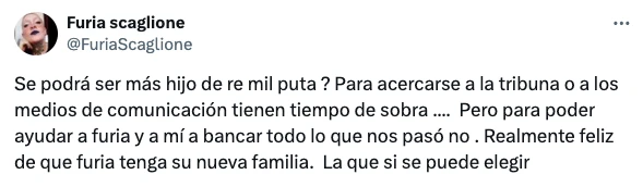 Así fue como desde su cuenta de X (ex Twitter) publicó: "¿Se podrá ser más hijo de re mil pu...? Para acercarse a la tribuna o a los medios de comunicación tienen tiempo de sobra, pero para poder ayudar a Furia y a mí a bancar todo lo que nos pasó, no. Realmente feliz de que Furia tenga su nueva familia. La que sí se puede elegir".
