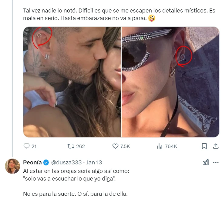 Casi imperceptible, pero tal vez la raíz de todo este escándalo: Se trata de un par de aritos con forma de herradura que comparten Icardi y La China, ambos sobre la oreja derecha, él sobre la parte superior y ella sobre la inferior. “Tal vez nadie lo notó”, comenzó diciendo una seguidora de ambos destacando los aritos en cada uno y planteando: “Al estar en las orejas sería algo así como: 'solo vas a escuchar lo que yo diga'. No es para la suerte. O sí, para la de ella”.