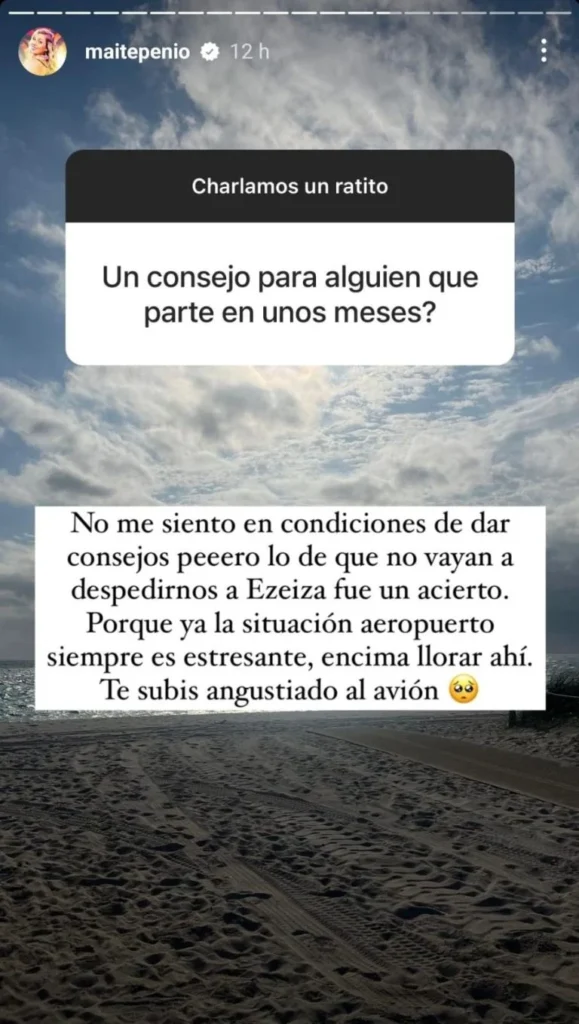 Por último, también hubo alguien que le pidió un consejo, aunque ella no se sintió cómoda. “No me siento en condiciones de dar consejo”, empezó diciendo Maite. No obstante, a la misma respuesta, le agregó: “Que no vaya nadie a despedirnos a Ezeiza fue un acierto. Porque ya la situación aeropuerto siempre es estresante, encima llorar ahí. Te subis angustiado al avión”, cerró Peñoñori desde Miami.