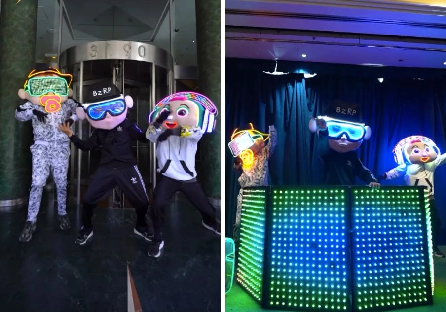 Pero las sorpresas no terminaron allí. El evento incluyó un muñeco gigante (y con luces) con la máscara del productor Bizarrap que animó la pista de baile y un súper parque de diversiones interno. La instalación incluyó un mini samba, juegos mecánicos, peloteros inflables y hasta una máquina de algodón de azúcar, asegurándose que el aburrimiento no tuviera lugar.