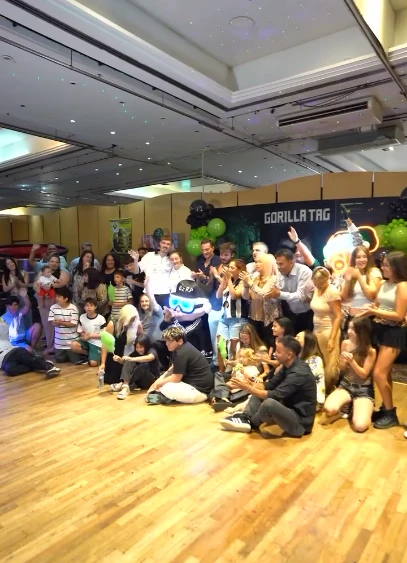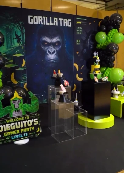 Además de la torta, la mesa dulce incluyó muffins y golosinas temáticas para todos los asistentes. Para elevar la experiencia, se instalaron estaciones de juegos de realidad virtual, permitiendo que los niños (y no tan niños) jugaran como si estuvieran dentro del propio Gorilla Tag.