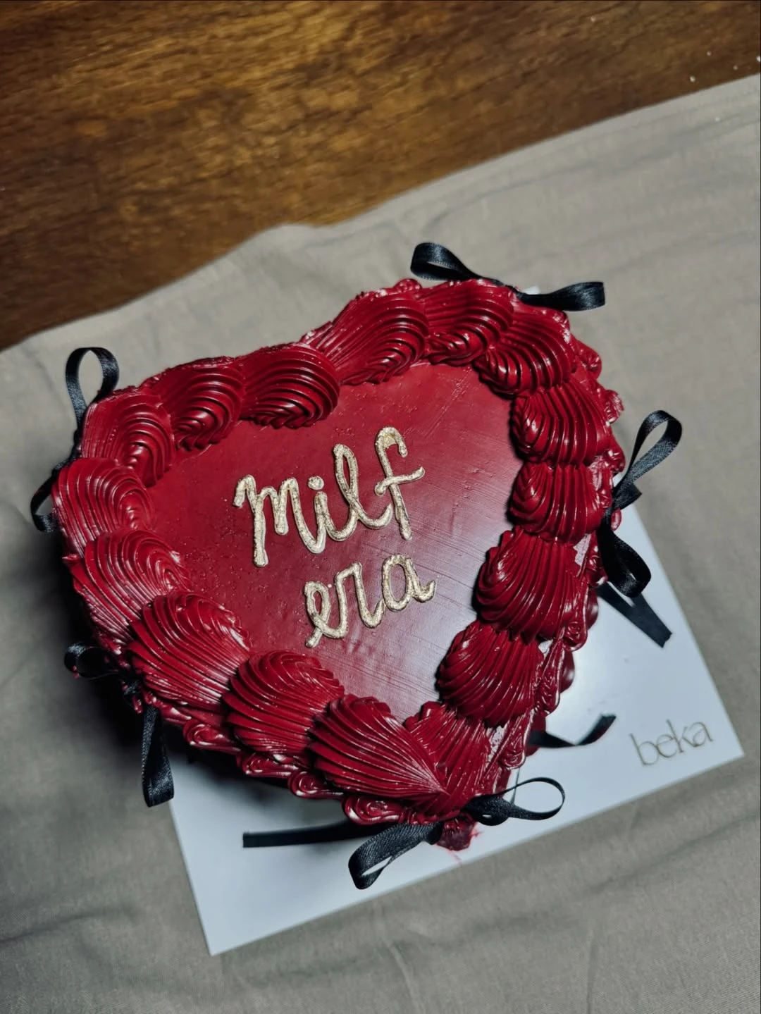 Uno de los detalles más llamativos del cumpleaños fue la torta, que se convirtió en protagonista absoluta. De forma de corazón y cubierta por una intensa crema roja, el pastel llevaba escrita en letras doradas la frase “milf era”, en clara referencia al texto que Eva eligió para acompañar sus posteos: “Entering my MILF era”. El diseño incluía decoraciones con volados y lazos negros, aportando un toque sofisticado y audaz que no pasó desapercibido.