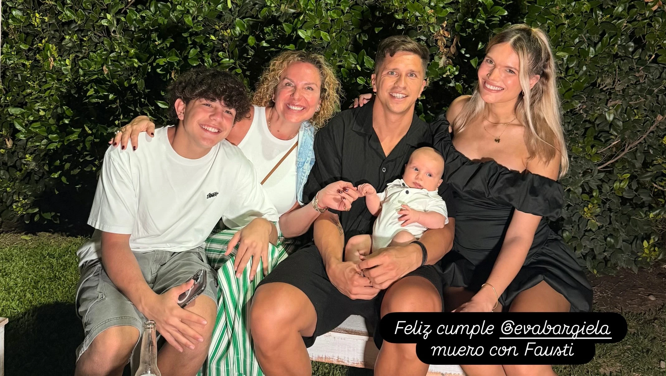 El festejo se realizó en un espacio al aire libre, con césped y una pileta como parte del escenario, lo que aportó un clima relajado y familiar. En las fotos se puede ver a Eva rodeada de sus seres queridos, entre ellos Gian, quien no se despegó de ella ni del pequeño Faustino durante toda la noche. La pareja posó junto a familiares y amigos, mostrando la felicidad que los une en esta nueva etapa.
