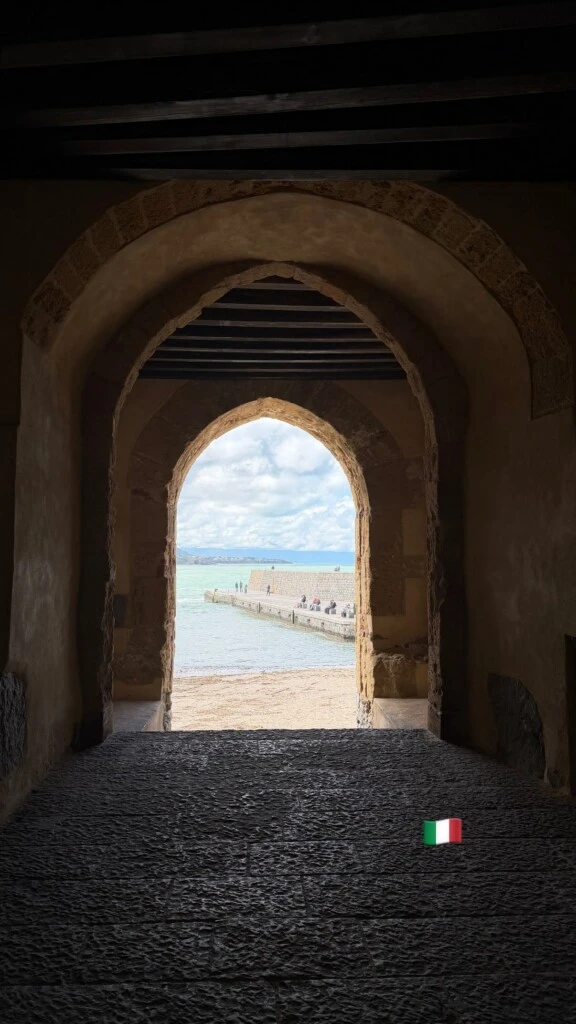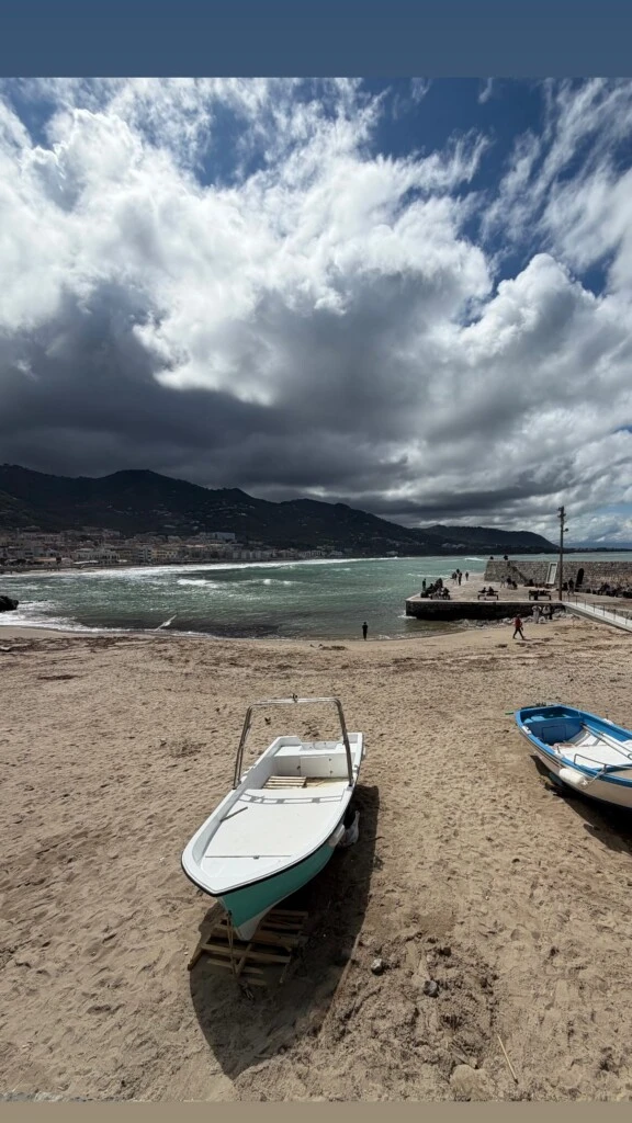 El carrusel continuó con postales de paisajes: un arco de piedra que enmarcó el mar turquesa, una playa con pequeñas embarcaciones y un cielo dramático, y otra toma desde una construcción histórica que dio paso a la costa. Todo cerró con una imagen que incluyó la bandera italiana, reforzando el espíritu del viaje.