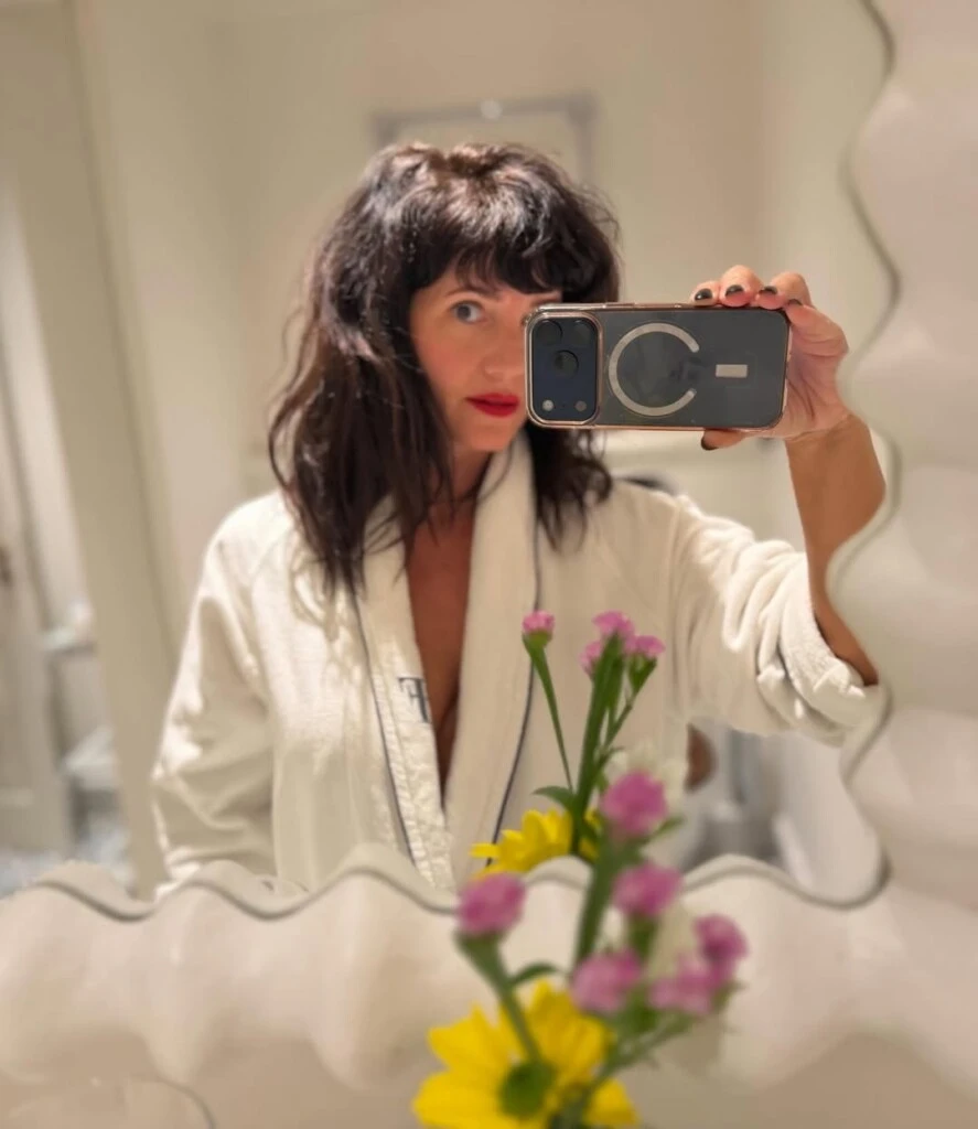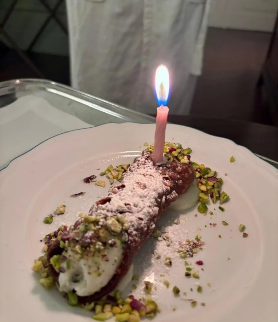 En la primera foto, se vio el detalle del postre: un cannolo espolvoreado con azúcar impalpable y pistachos, coronado con una vela encendida. Luego, apareció una selfie frente al espejo, con bata blanca, labios rojos y flores en primer plano, en una escena íntima y relajada.