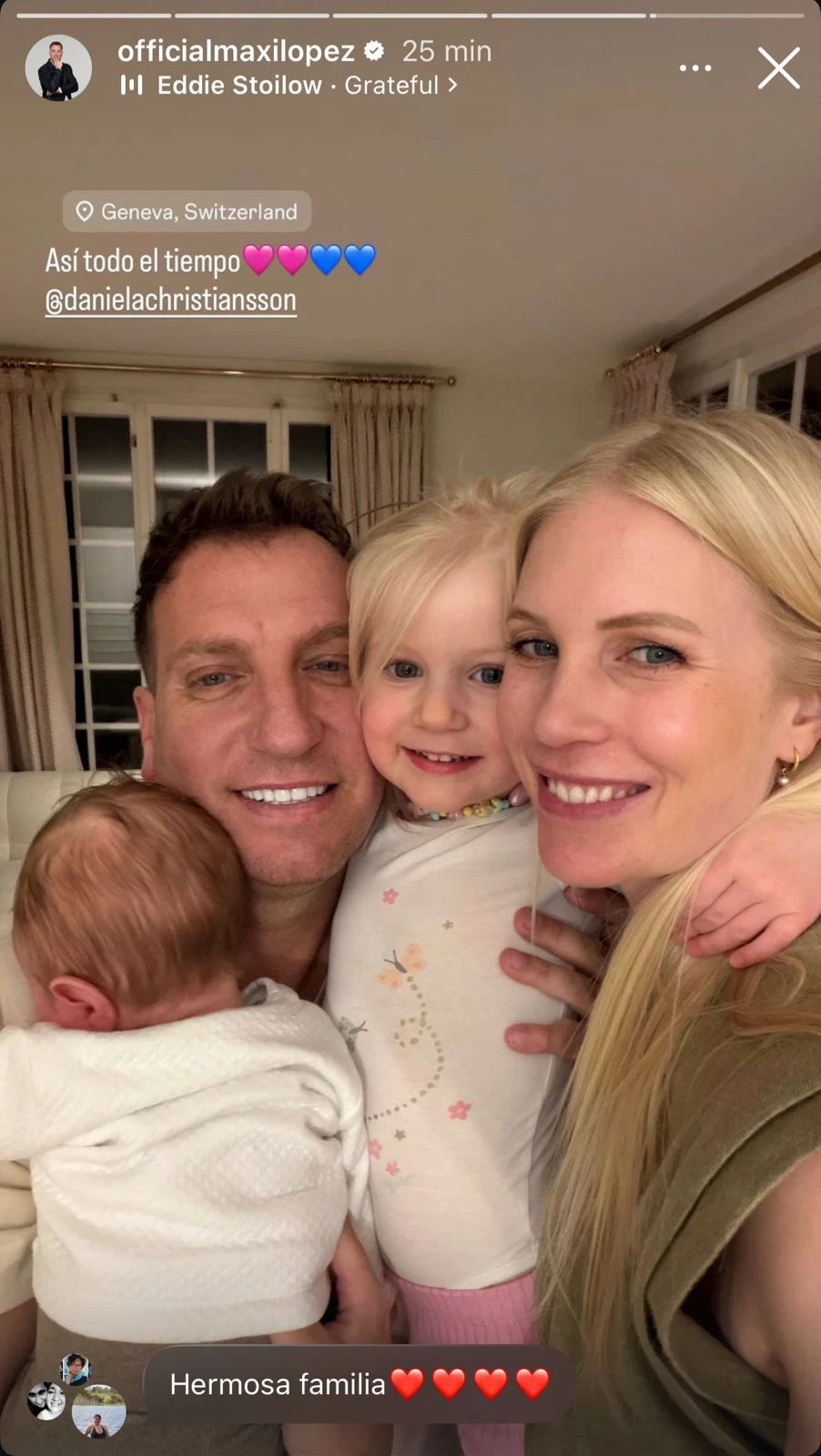 Pero el momento más especial llegó este martes, cuando compartió en sus historias de Instagram una postal íntima desde su casa en Suiza. En la imagen se lo ve abrazado a Daniela y a sus pequeños, todos sonrientes y visiblemente felices por el reencuentro. La escena transmite calidez y complicidad familiar, luego de un tiempo de distancia marcado por compromisos laborales.