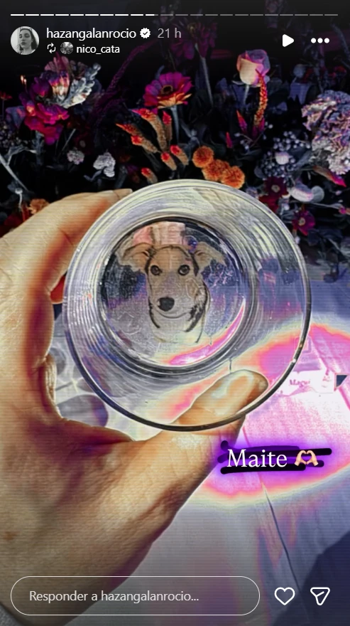 En medio de la celebración, los invitados descubrieron unos vasos personalizados con la imagen de Maite, la perrita de la pareja.