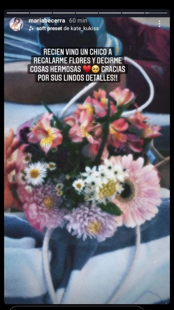 En el día de ayer María Becerra compartió una fotografía en el que agradecía a un joven sin nombre el hermoso gesto que había tenido con ella regalándole un bellísimo ramo de flores. "Recién vino un chico a regalarme flores y decirme cosas hermosas. Gracias por sus lindos detalles", escribió Becerra en su cuenta de Instagram. De fondo en la imagen podía notarse una gorra muy similar a las que utiliza Rusherking y una manta a rayas que utilizó en el mismo día el joven para asistir a la playa.