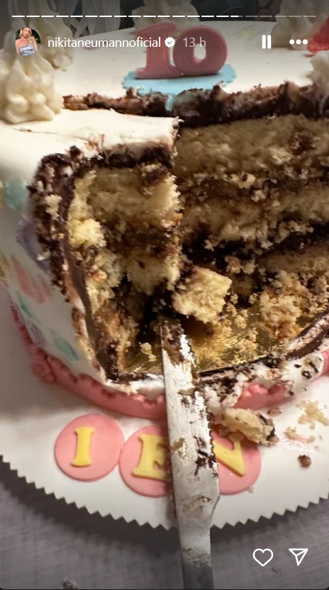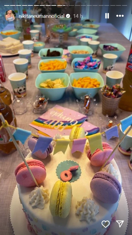Por empezar, Nicole subió a sus redes una imagen de la enorme mesa principal de su casa repleta de exquisiteces como sandwiches de miga, snacks de todo tipo, bombones, muchas golosinas, jugos de frutas, y una increíble torta de vainilla y chocolate cuyo relleno causó estragos entre los invitados.
