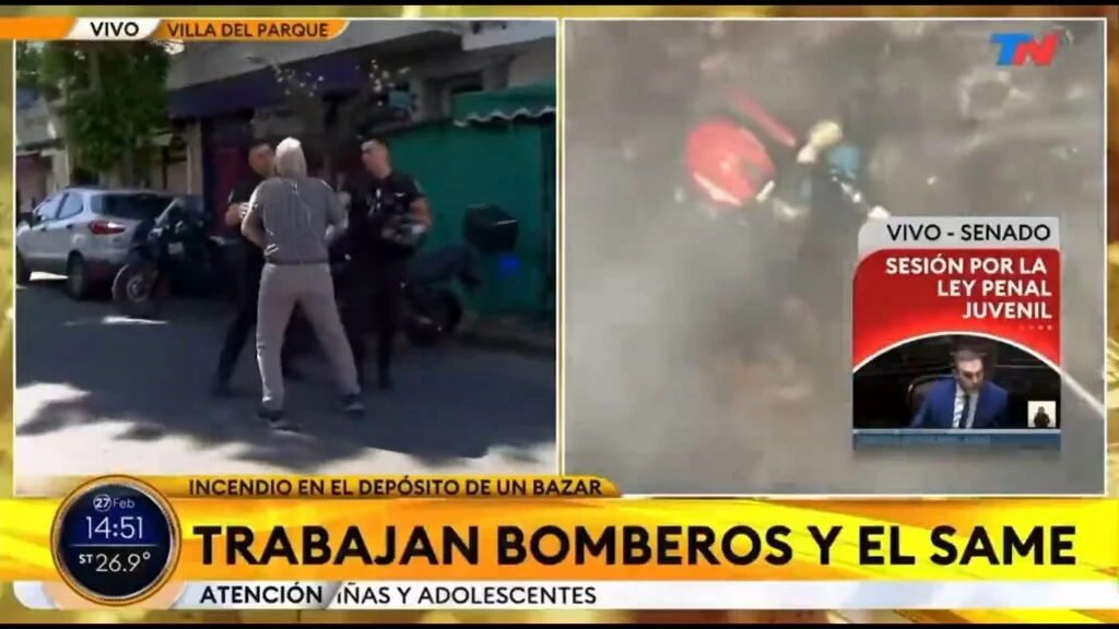 La tarde de este viernes quedó marcada por un episodio tan tenso como inesperado durante la cobertura del incendio que arrasó un bazar ubicado en General José G. Artigas 4720, en pleno barrio porteño de Villa Pueyrredón. El siniestro —que obligó a evacuar a más de 120 personas y dejó al menos 10 asistidos por inhalación de humo, entre ellos cuatro bomberos— generó una enorme movilización policial, sanitaria y de Bomberos de la Ciudad.