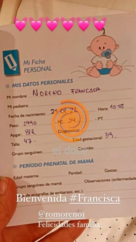 “Bienvenida Francisca! Con 39 semanas de gestación Rocio Moreno y Paulo Londra se convierten en padres por segunda vez!”, comenzó anunciando en exclusiva Gallardo. Y continuó precisando la información, “Clínica Allende del Cerro Córdoba, a las 10.55 horas, pesando 2990 kilogramos. MUCHAS BENDICIONES”