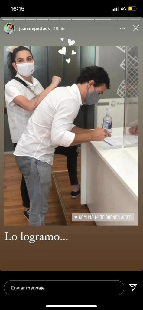 Para la ocasión la pareja se vistió "matcheada", con sendas camisas blancas, jeans y zapatillas. Para hacer pública su buena nueva, Juana compartió primero dos imágenes en Instagram Stories mientras ponían sus firmas en el Registro Civil de Coronel Díaz al 2100.