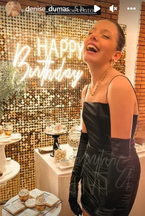 La cumpleañera optó por un vestido negro negro corto con guantes y pelo recogido para su gran celebración.