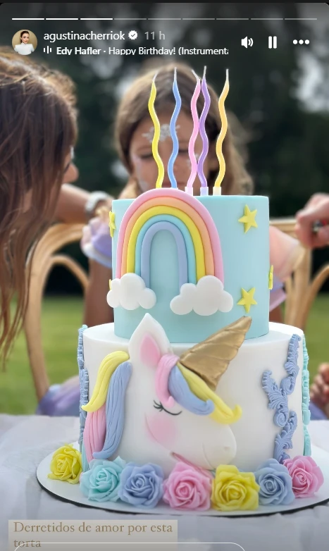 En tanto, combinó perfectamente con el soñado vestido de la cumpleañera, quien lució durante toda la jornada un diseño celeste pastel estilo princesa con dibujos de unicornios en su falda. "Derretidos de amor por esta torta", comentó Agustina en una historia que subió a sus redes.