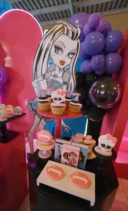 La temática del cumpleaños fue Monster High, las muñecas inspiradas en monstruos famosos del cine y la literatura. Por lo que el look de Chloe, así como toda la decoración del salón y su inmenso parque fueron especialmente pensados en recrear dichos personajes.