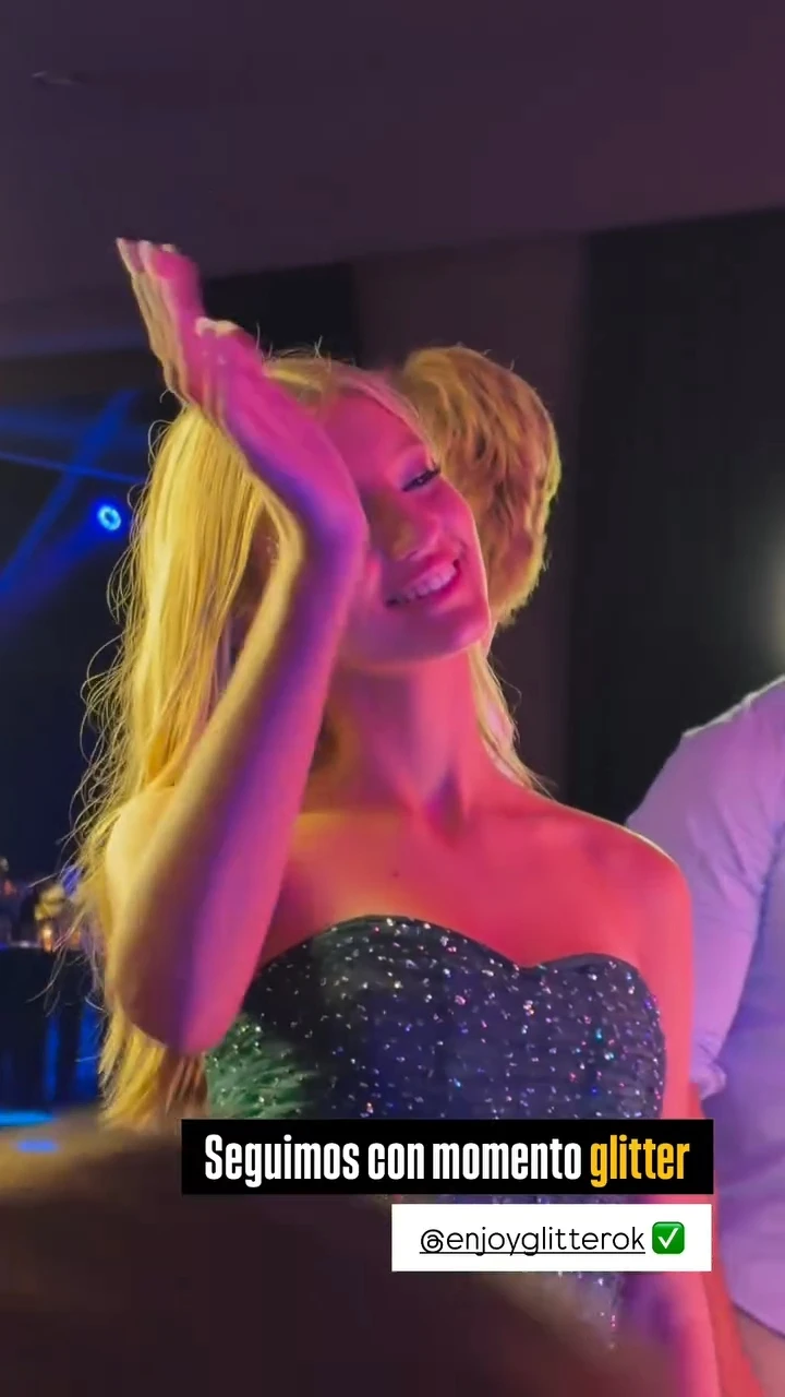 Si algo marcó el pulso del festejo fue la entrada: Allegra hizo su aparición a través de una enorme pantalla LED que se abrió para darle paso, con bengalas electrónicas y un clima de ovación que convirtió ese instante en el gran “wow” de la noche. A su lado estuvo Luca, su hermanito, que apareció vestido a tono y la acompañó de la mano, en una postal familiar que se volvió uno de los momentos más comentados.
