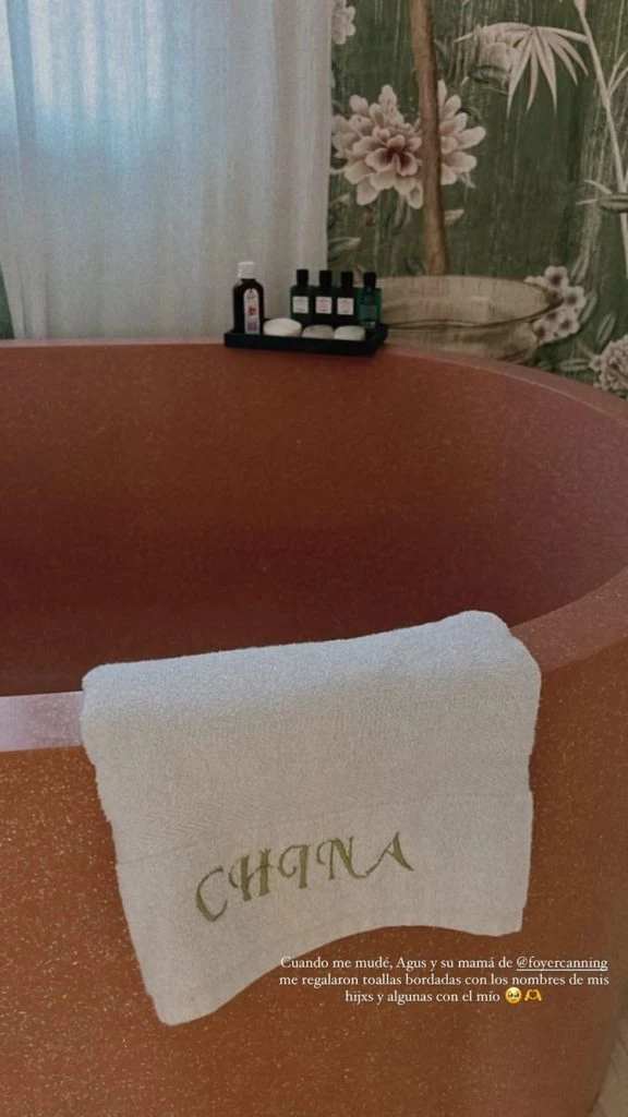 "Entonces lo que decidí es que voy a poner una cortina que vaya desde el techo para que no se moje todo el baño", comentó China Suárez y añadió un detalle para los curiosos sobre la marca que la asesora en las modificaciones, "Las cortinas me las hace @abaxdeco. Todo lo que hacen es divino, me hicieron también el probador de pana que tengo en el vestidor.