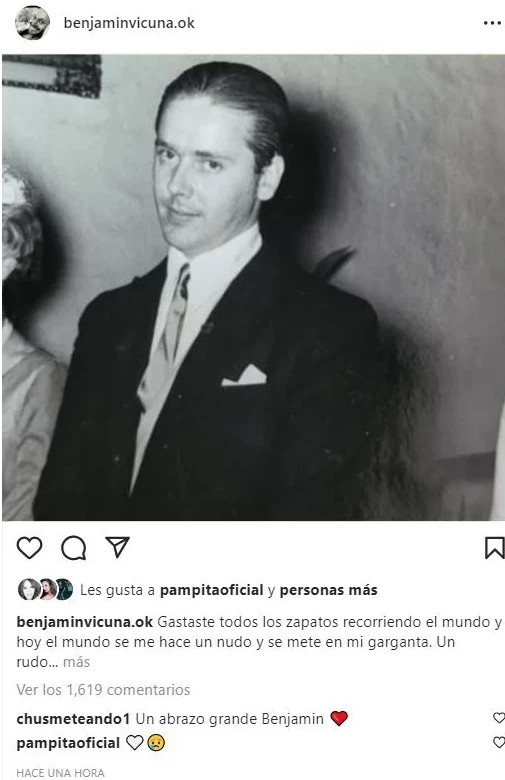 Sobre esa línea, Vicuña acompañó su posteo con una foto vintage de su padre para despedirse y señaló: “Hoy puedes volver a bailar rock and roll, hoy abrazas a tu madre y a tu nieta, en lo que estoy seguro será una fiesta cósmica. A brillar Padre, don Juan Pablo. Elvis has left the building”.