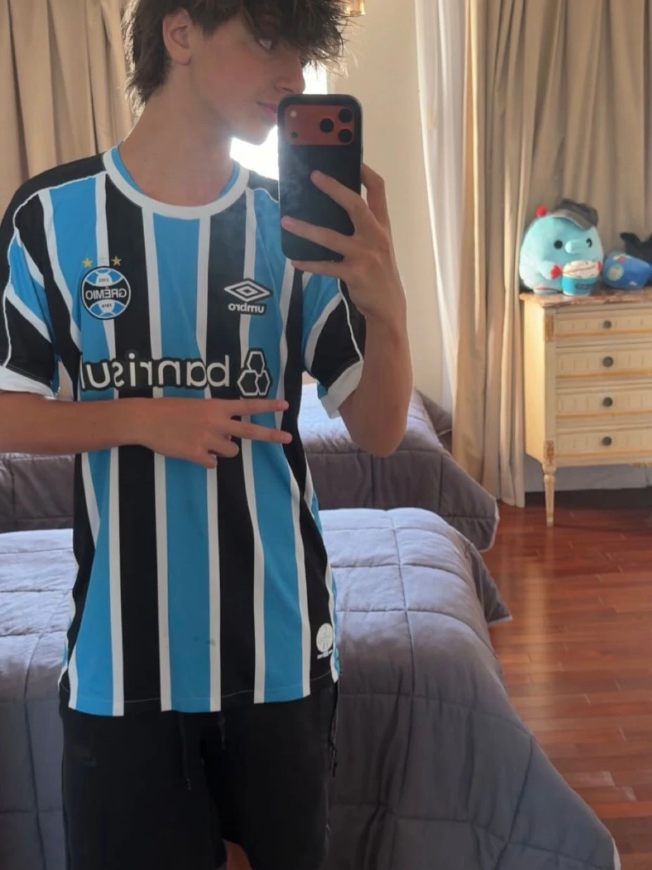 Otra de las fotos lo muestra posando frente al espejo con la camiseta de Gremio, de Brasil, un look que mezcla deporte y adolescencia, y que deja ver que, más allá de la tormenta mediática que rodea a sus padres, Benedicto sigue conectado con su interés por el fútbol y la cultura juvenil.