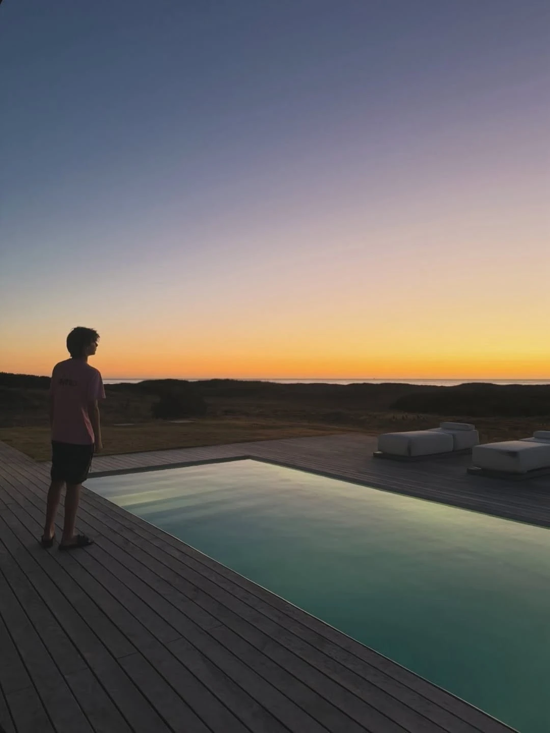 Entre las imágenes más emotivas aparece la de un atardecer frente a una pileta, donde se lo ve contemplando el cielo en tonos rosados y naranjas. El entorno sereno contrasta de lleno con el clima agitado del mundo adulto que los rodea, y marca un momento de calma dentro de estas semanas tan movidas.