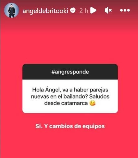 Uno de los seguidores de Ángel, oriundo de Catamarca, le preguntó: "¿Van a haber parejas nuevas en el Bailando?". En ese sentido, el conductor fue seco con su respuesta "Si. Y cambios de equipo", reveló tajante De Brito.