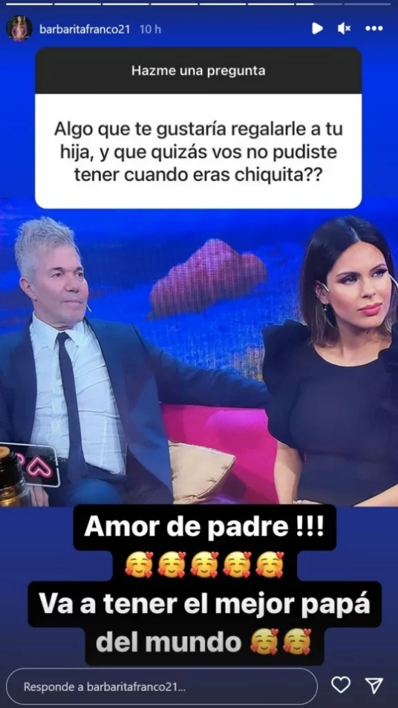 "¿Qué te gustaría regalarle a tu hija que vos no pudiste tener cuando eras chiquita?", fue específicamente la pregunta que le realizaron a Barby. Ella, por su parte respondió: "Amor del padre. Va a tener el mejor papá del mundo", dijo con dulzura Barby, junto a una foto con Burlando.