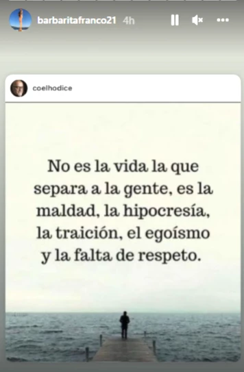 En medio de los rumores de embarazo, lanzó: “No es la vida que la que separa a la gente, es la maldad, la hipocresía, la traición, el egoísmo y la falta de respeto”. Si bien no lo escribió ella, sí replicó en su propio perfil la imagen compartida por @CoheloDice.