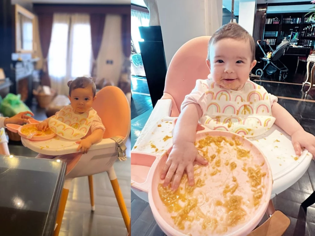 Después del baño, la madre primeriza le elige un outfit hermoso -siempre combinada de pies a cabeza- y pasa al comedor. Aunque confesó hace un tiempo que no se encarga de las preparaciones, Franco disfruta de darle la comida a su bebé y tomarle fotografías, mientras la pequeña se ve notablemente satisfecha probando sus primeros alimentos, y dejando rastros en su carita o ropa.