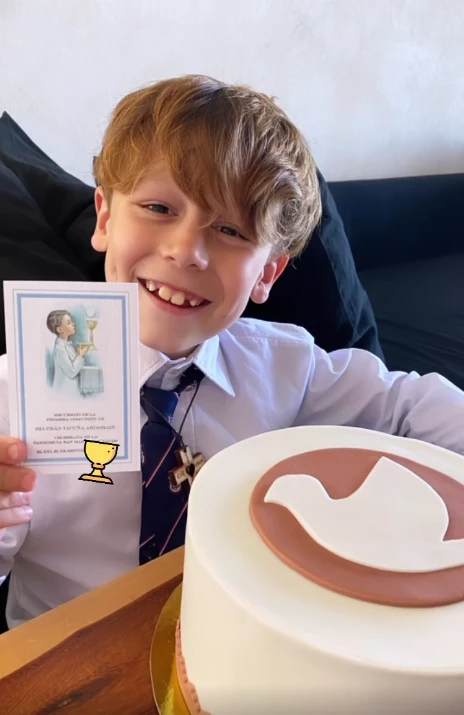 Pampita también compartió cada momento en sus redes sociales. La modelo publicó otra foto de su hijo durante el festejo después de la ceremonia. En la imagen puede verse a Beltrán junto a su tarjeta de comunión y una torta hecha para la ocasión.