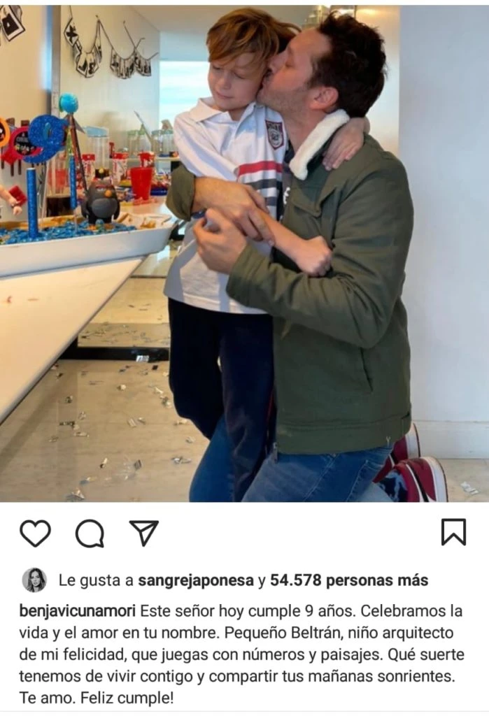 “Este señor hoy cumple 9 años. Celebramos la vida y el amor en tu nombre. Pequeño Beltrán, niño arquitecto de mi felicidad, que juegas con números y paisajes. Qué suerte tenemos de vivir contigo y compartir tus mañanas sonrientes. Te amo. Feliz cumple!”, escribió Benjamín.