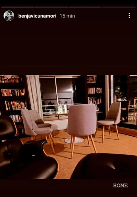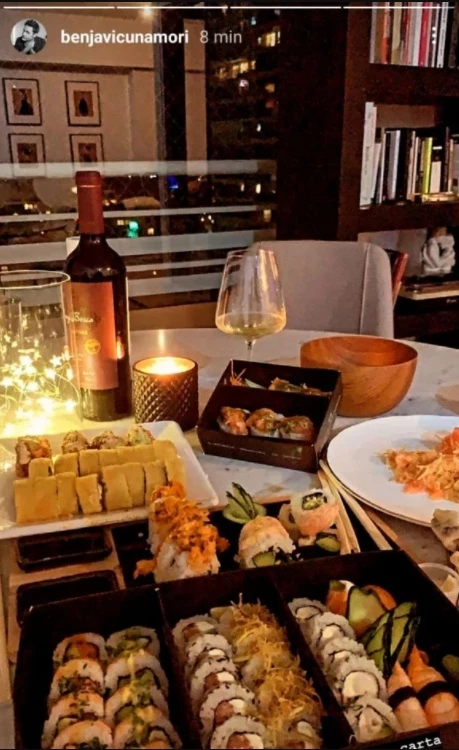 "Casa", escribió Benjamín junto a una postal que muestra la mesa del living, sus respectivas sillas, un sillón negro súper confortable y una extensa biblioteca repleta de libros. Luego, posteó otras story donde mostró su cena a la luz de las velas. El artista degustó una tabla de sushi y un vino blanco.