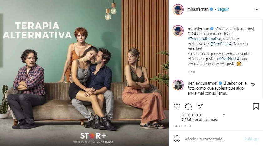Sucede que los actores protagonizan 'Terapia Alternativa' por Star+, que se estrena el próximo 24 de agosto en dicha plataforma, junto a Carla Peterson, Julieta Cardinali y Fernán Mirás. Precisamente este último, compartió una imagen del poster de la ficción y les pidió a sus seguidores que no se pierdan la desopilante historia, que narra sobre dos amantes que asisten a terapia para terminar con su vínculo.