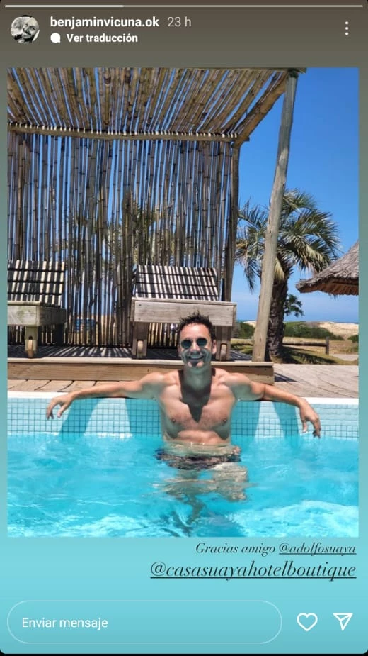 "Gracias @adolfosuaya @casasuayahotelboutique", escribió Benjamín Vicuña en una historia de Instagram compartiendo una imagen exclusiva de la piscina y residencia de lujo en la que se hospeda. El complejo hotelero rodeado de bungalows y chalets completamente equipados se encuentra en el kilómetro 185,5 de la ruta 10, teniendo un acceso directo a la magnifica playa Brava.