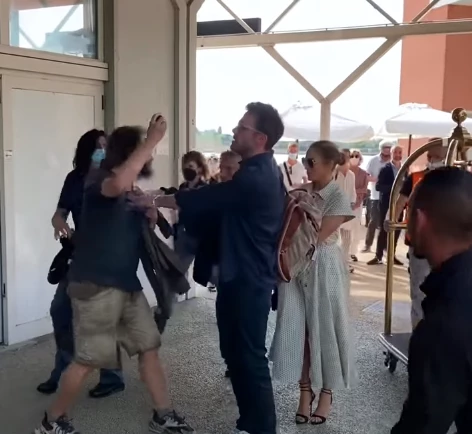 Pese a que la pareja estaba rodeada por guardaespaldas, Affleck reaccionó haciéndolo a un lado. Tras apartar al acosador con un suave empujón, la pareja continuó su camino tomada de la mano.