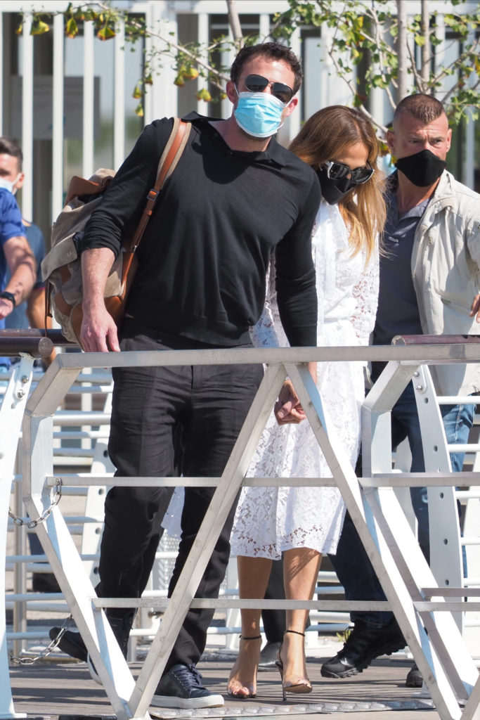 Desde su llegada a Venecia, Bennifer fue blanco de los paparazzi. Así fue su desembarco a la sede del festival: vestido de negro, Affleck cargaba un bolso de mano; J-Lo lució un total white look en encaje, conformado por una falda y una delicada blusa con lazo anudado al cuello.