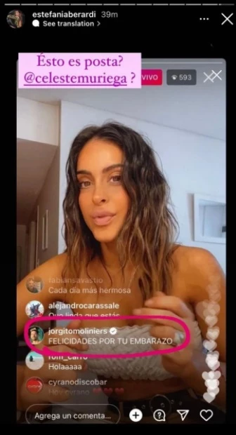 En la captura se puede ver a Muriega mientras realiza una transmisión en vivo e interactua con sus seguidores. Y, entre los comentarios, alertó a los usuarios el mensaje que le dejó Jorgito Moliniers: “Felicidades por tu embarazo”, resaltó en mayúscula.