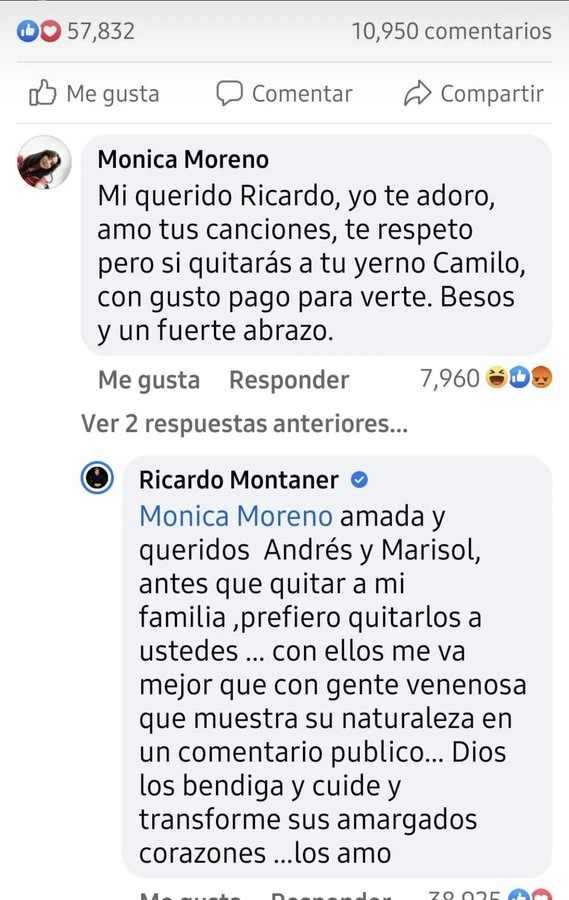 Si bien el mensaje de la mujer fue de manera educada, el haber cuestionado la presencia de Camilo en el show "Los Montaner" desató la furia de Ricardo. “Mi querido Ricardo, yo te adoro, amo tus canciones, te respeto, pero si quitaras a tu yerno Camilo, con gusto pago para verte. Besos y un fuerte abrazo", escribió su seguidora.