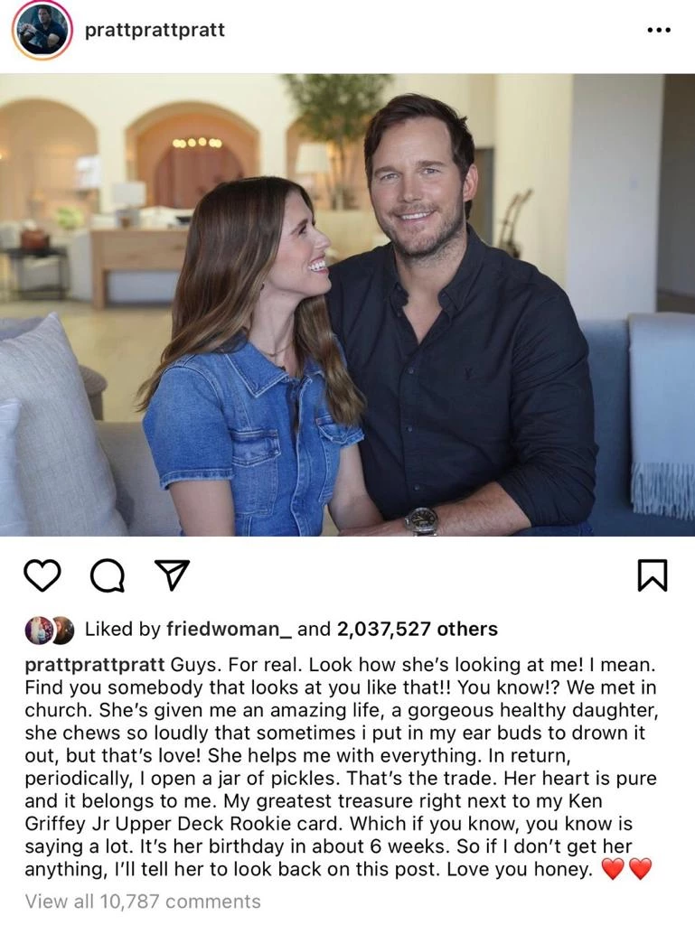 En una publicación en homenaje a su mujer por su cumpleaños, Pratt se deshizo en halagos pero quedó resaltado el problemático pasado junto a Faris. "Chicos, de verdad. ¡Fijense en cómo me mira! Quiero decir, ¡encuentren a alguien que los mire de esta forma!”, escribió en Instagram sobre Katherine Schwarzenegger junto a una fotografía de ambos.